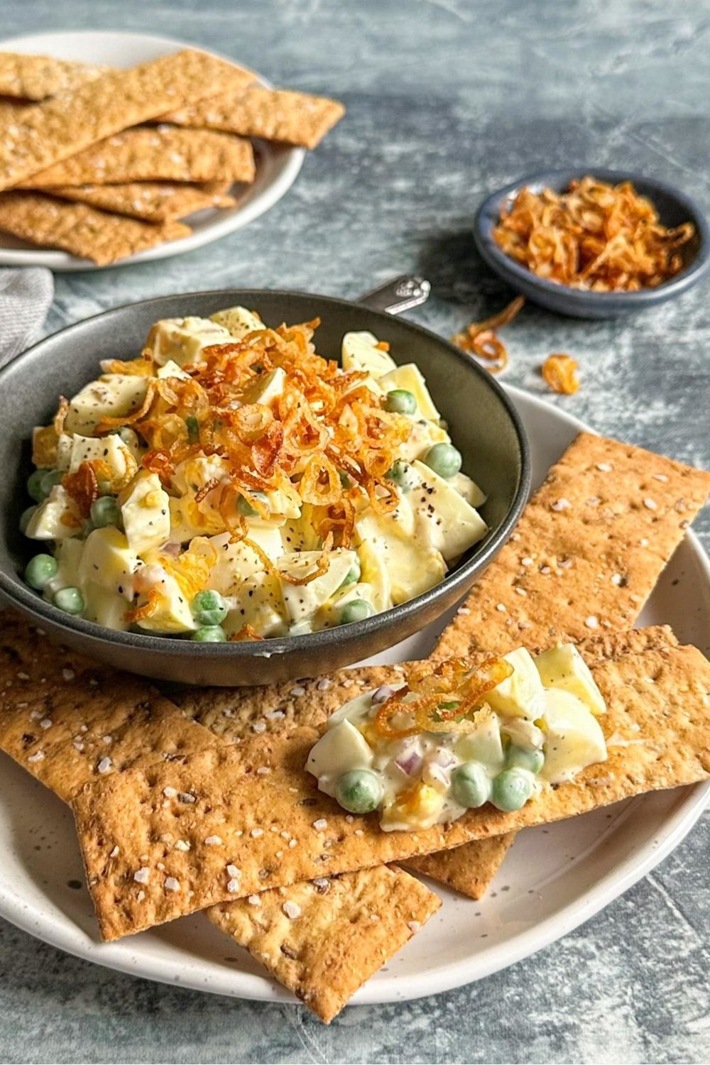We have a bit of an obsession with egg salad around here, so I’m always brainstorming ways to jazz it up. Spring is here, and it’s my favorite produce season. I can’t get enough fresh green peas, asparagus, scallions, and leafy greens. Egg salad with peas is the spring recipe you never knew you needed. The crispy fried shallots on top are optional but recommended!