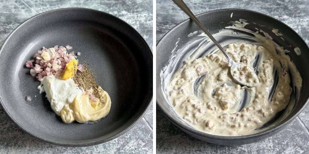 • I like to make the sauce first so the flavors have a few minutes to come together while I work on other things. Add the mayonnaise, yogurt, minced shallot, lemon juice, and Dijon mustard to the bowl. Mix well to combine the sauce ingredients evenly.